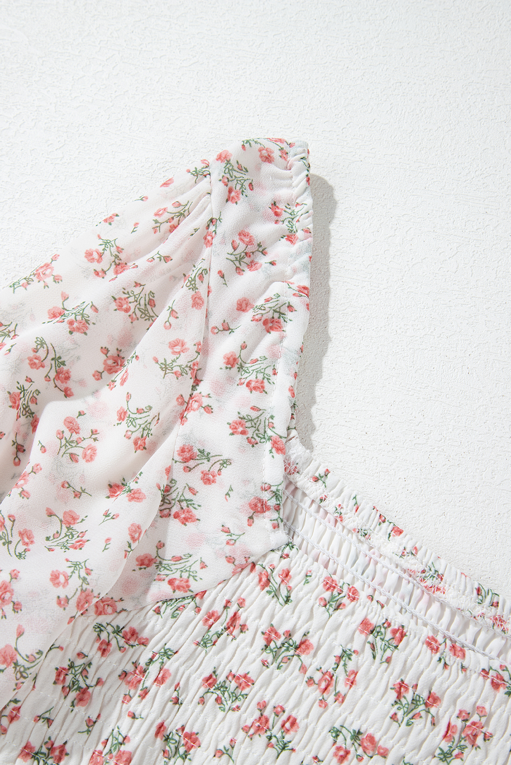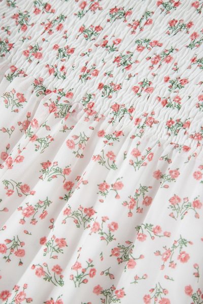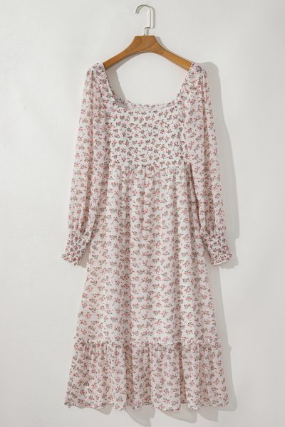 White Floral Print Shirred Ruffled Hem Square Neck Midi Dress