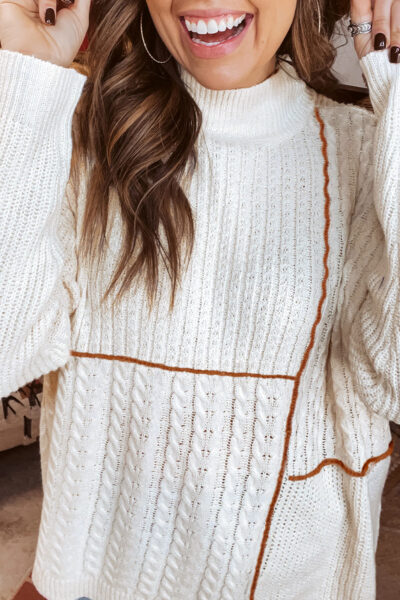 White Mix Texture Patchwork Contrast Stitch Mock Neck Sweater