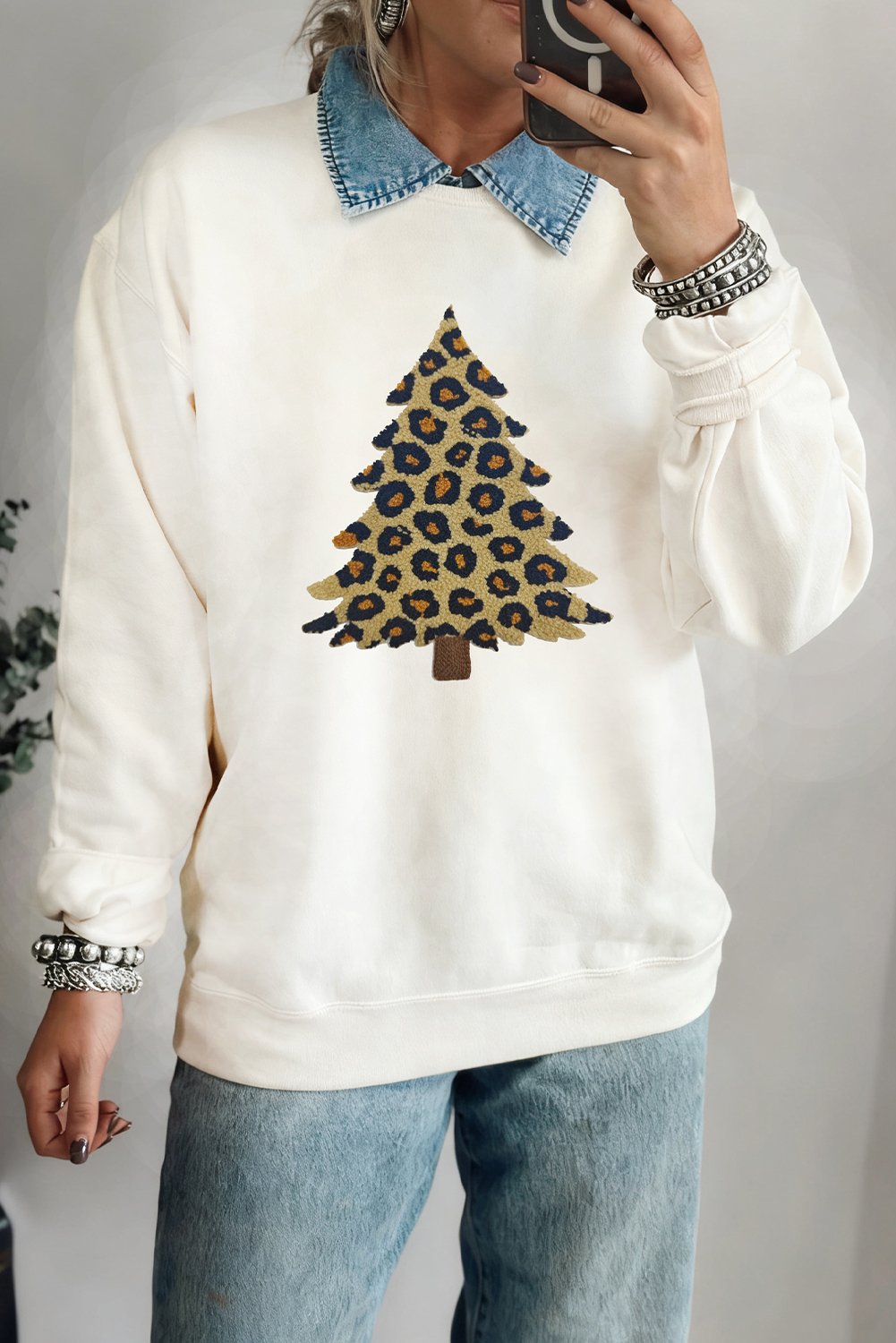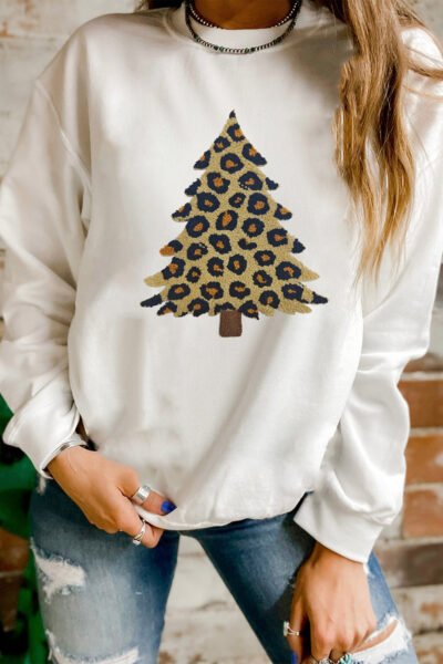 White Plush Leopard Tree Patched Drop Shoulder Sweatshirt