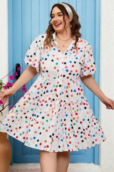 White Polka Dot Print Bubble Sleeve Button Up Plus Size Shirt Dress