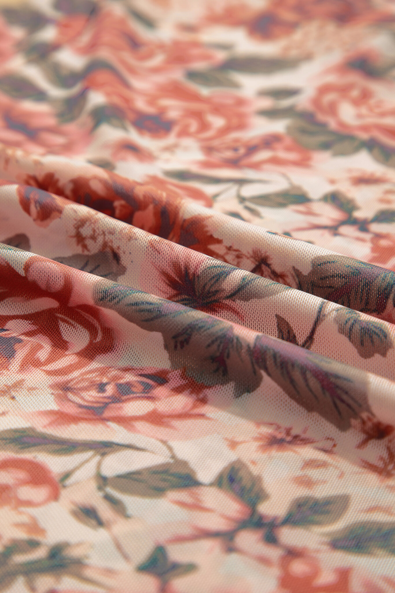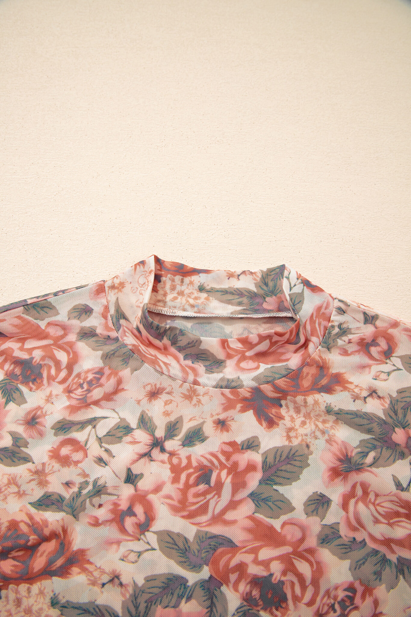 White Retro Floral Print Mock Neck Mesh Long Sleeve Top