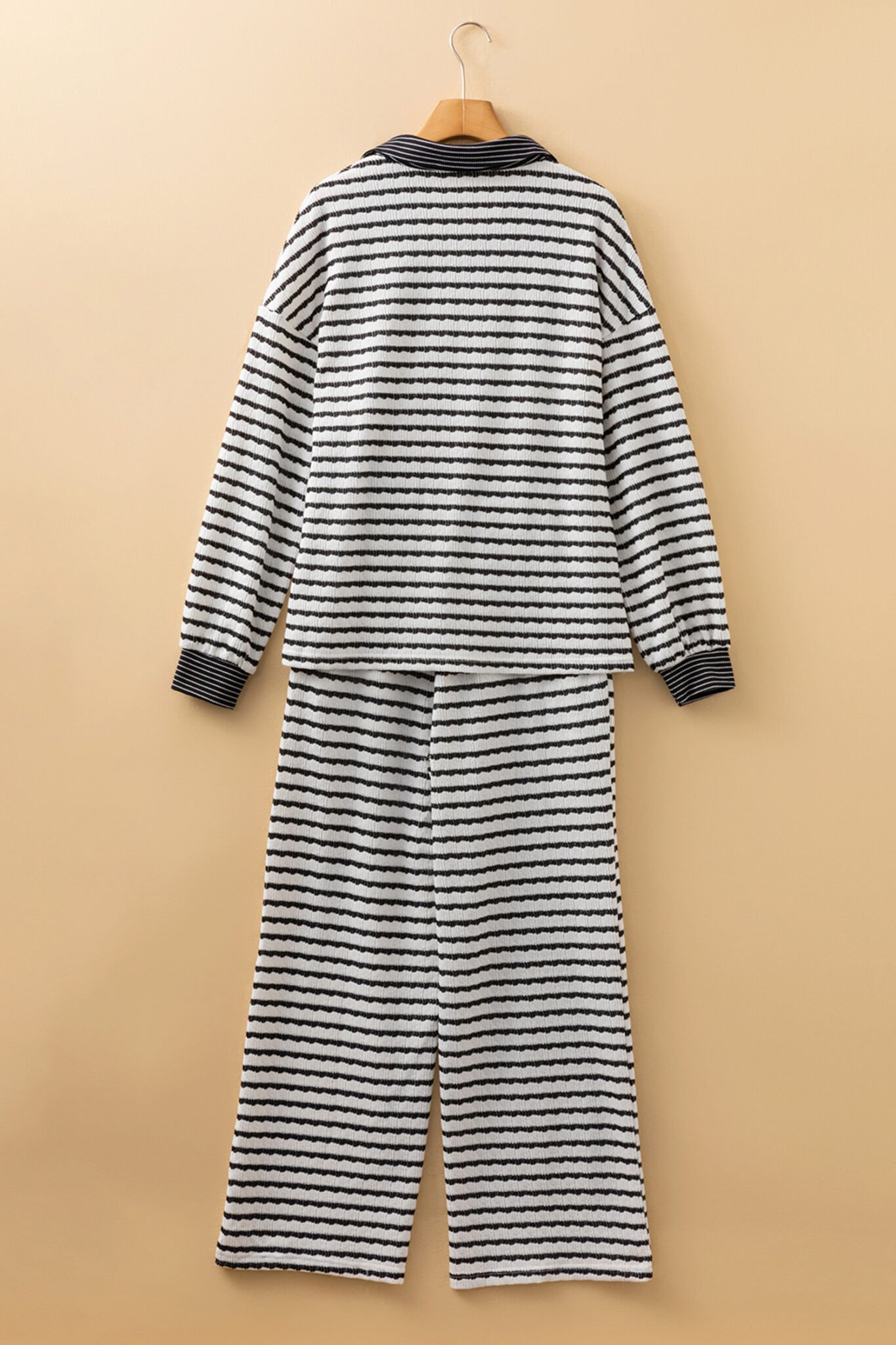 White Stripe Collared Pullover Top and Drawstring Pant Set