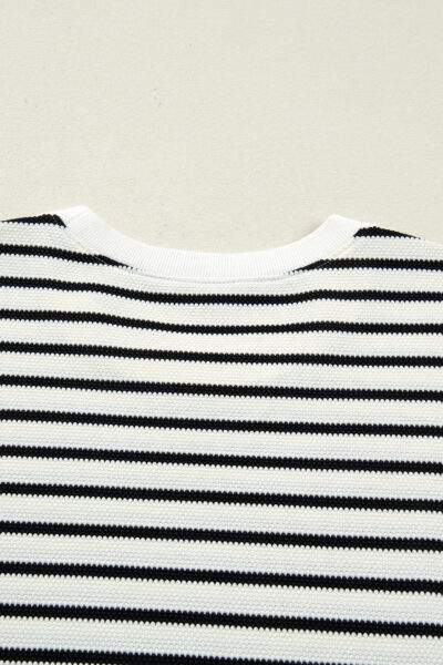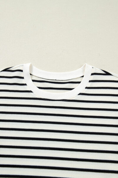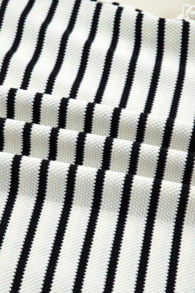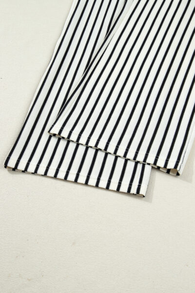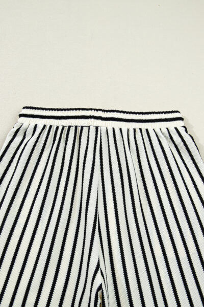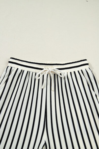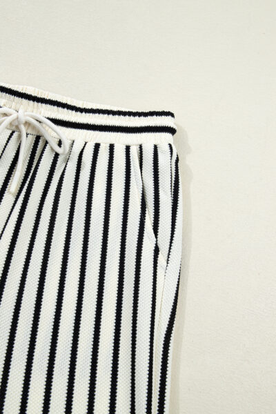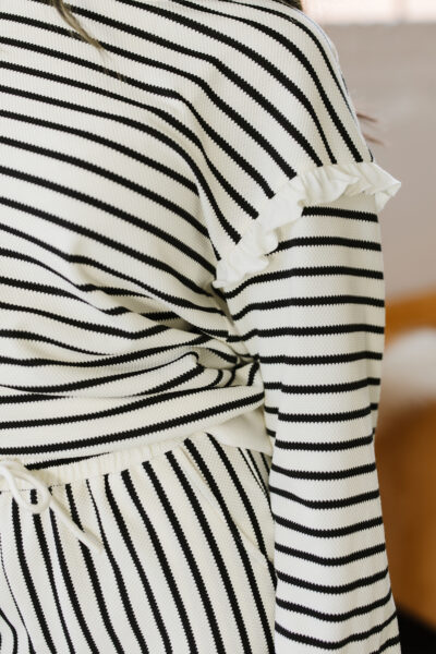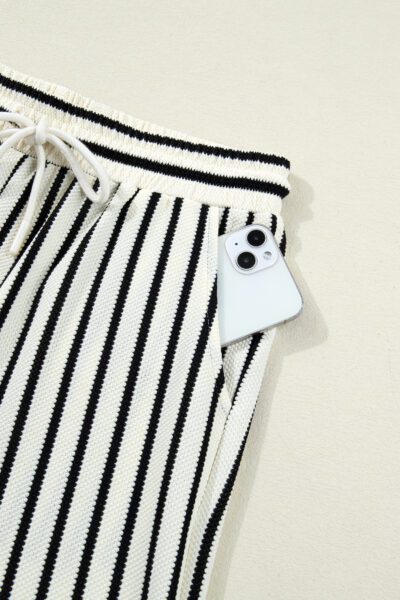 White Stripe Ruffle Trim Drop Shoulder Top Drawstring Loose Pant Set