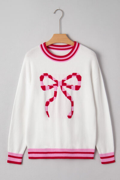 White Striped Trim Bow Graphic Round Neck Drop Shoulder Sweater