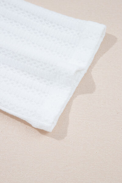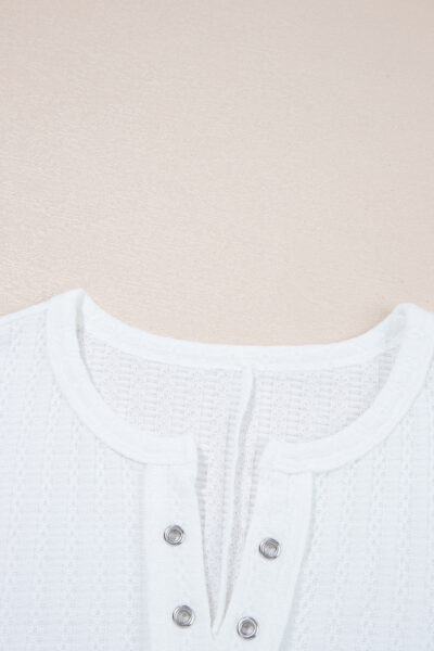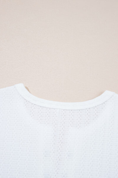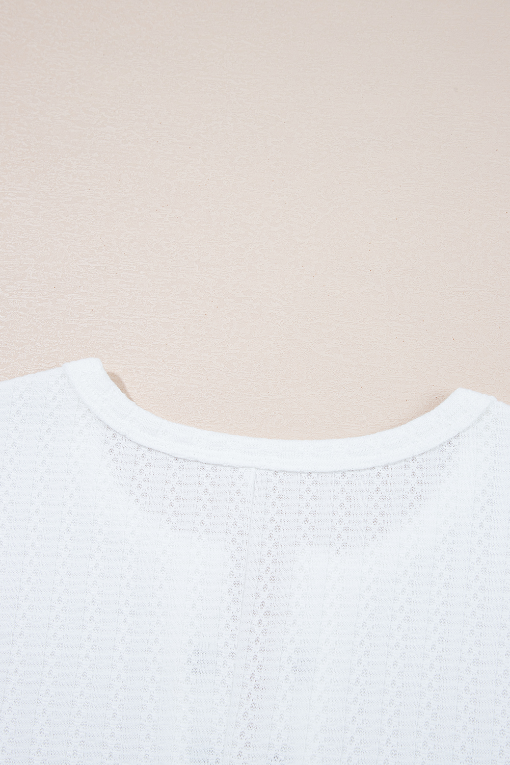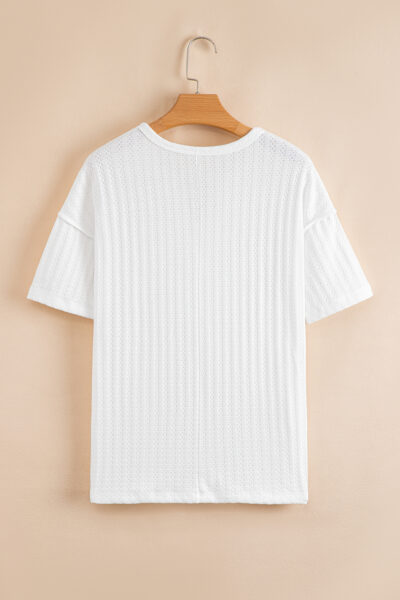 White Textured Hollow Grommet Placket Split Neck Short Sleeve Top