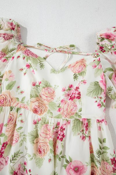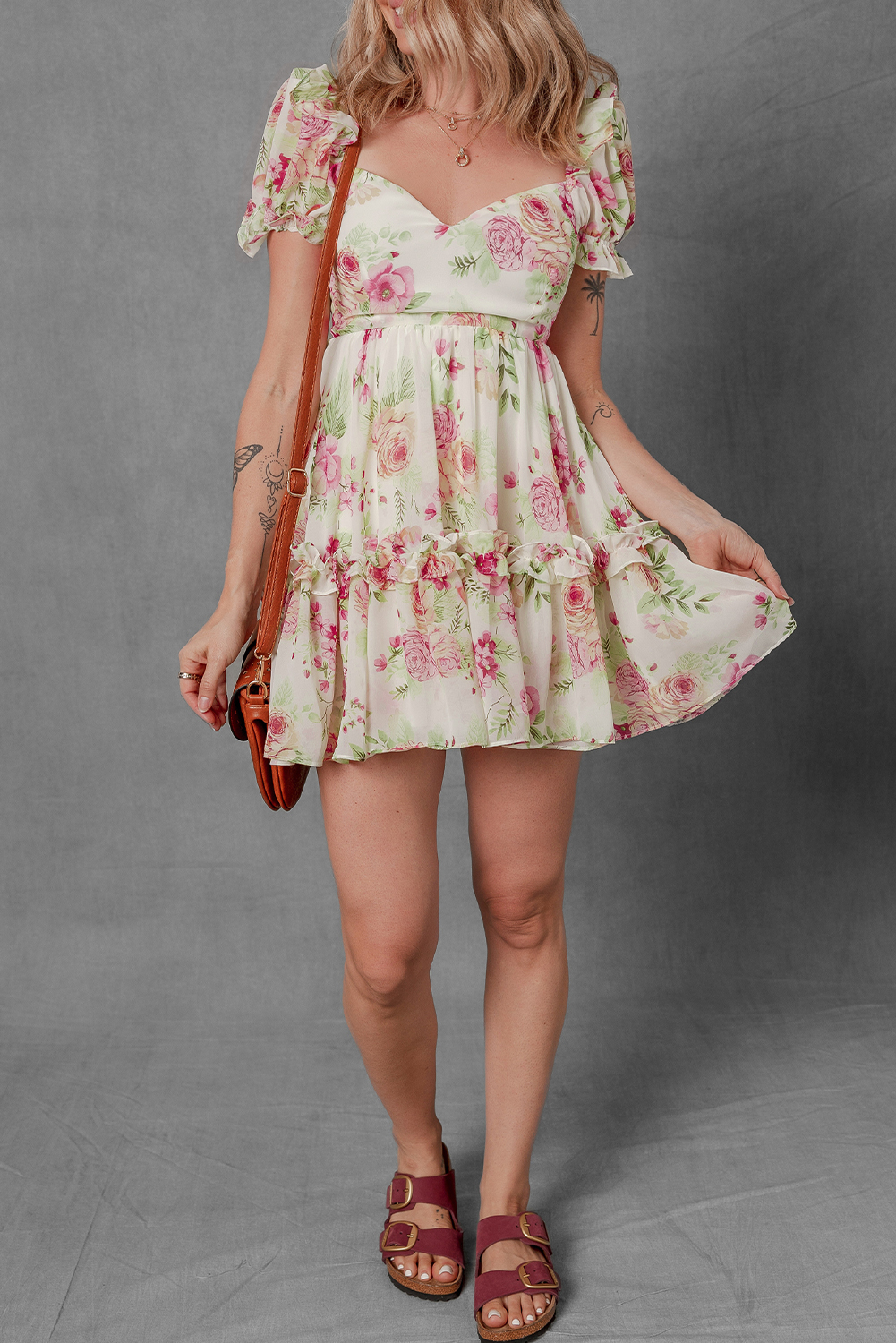 White Vibrant Floral Bubble Sleeve Sweetheart Neck Ruffle Mini Dress