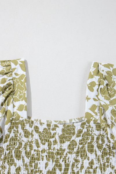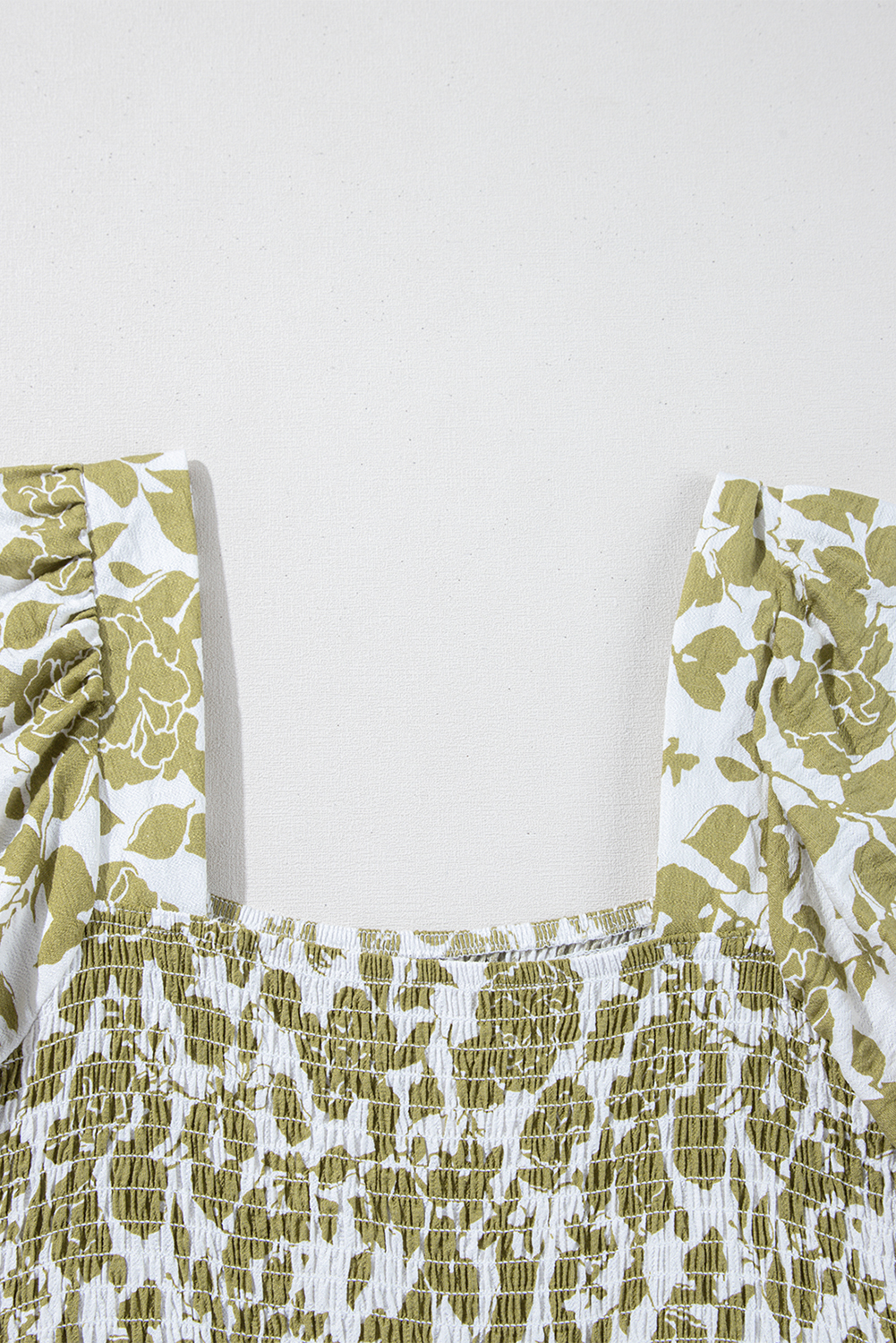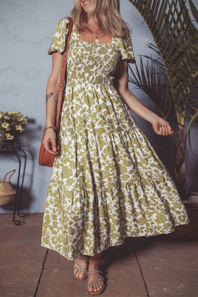 Yellow Boho Floral Square Neck Smocked Bust Puff Sleeve Tiered Long Dress