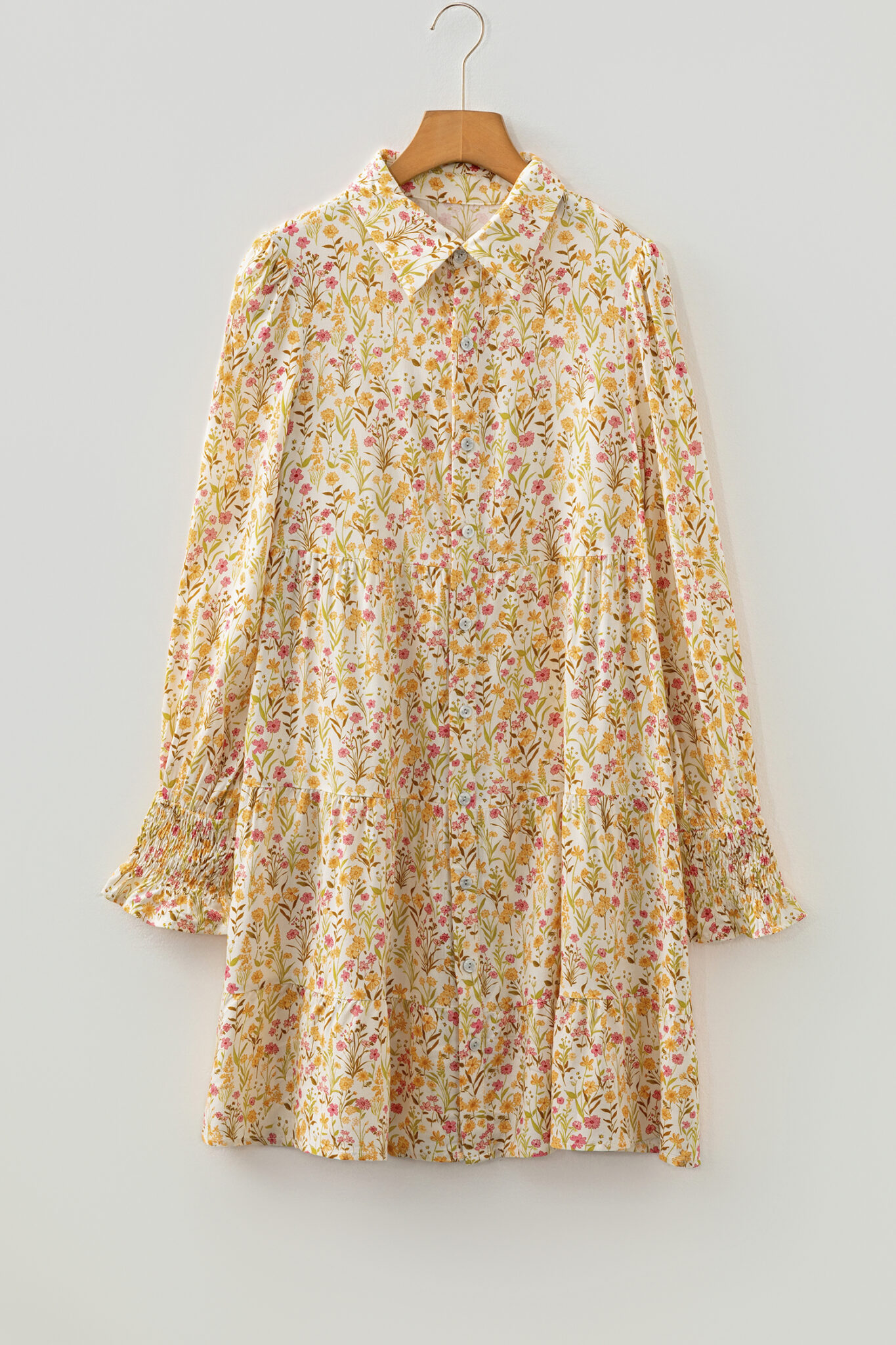 Yellow Floral Print Frilly Trim Smocked Cuff Long Sleeve Loose Shirt Dress